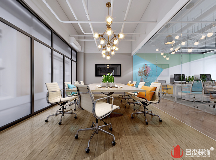 设计说明:设计师根据客户需求和公司形象文化传播,用高级灰覆盖墙面地面,但办公室内又以木地板拼接别具一格。各个区域功能性和实用性齐全,而装饰上最大打亮点在于灯饰的选择,造型独特吸引。整个办公空间既具有观赏性还具备人性化功能,茶室区等。而现代人快节奏、高频率、满负荷的状态正是渴望拥有这样一个转换精神的简约空间。